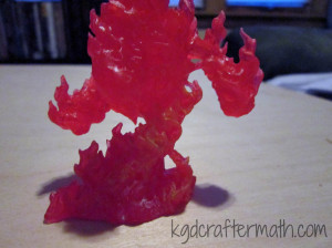 I wanted to take advantage of the transparency and use some light, so I did some fiddling around. I played around with a Halloween led candle from Target. I also played around with a few other leds, but I found that the target one was the brightest. The only problem is that the light doesn’t penetrate the mini fully. With the non-target led, I placed it at various points behind the mini to see if I could get better spread, but it didn’t look like I could. I did drill a hole into the mini so that the led would go up a little bit, but I didn’t go so far as to de-solder the led from the board to make it longer. I might try that with my other fire elemental, but I didn’t do it here. It did help a little bit, but I would still like to get more light through overall.